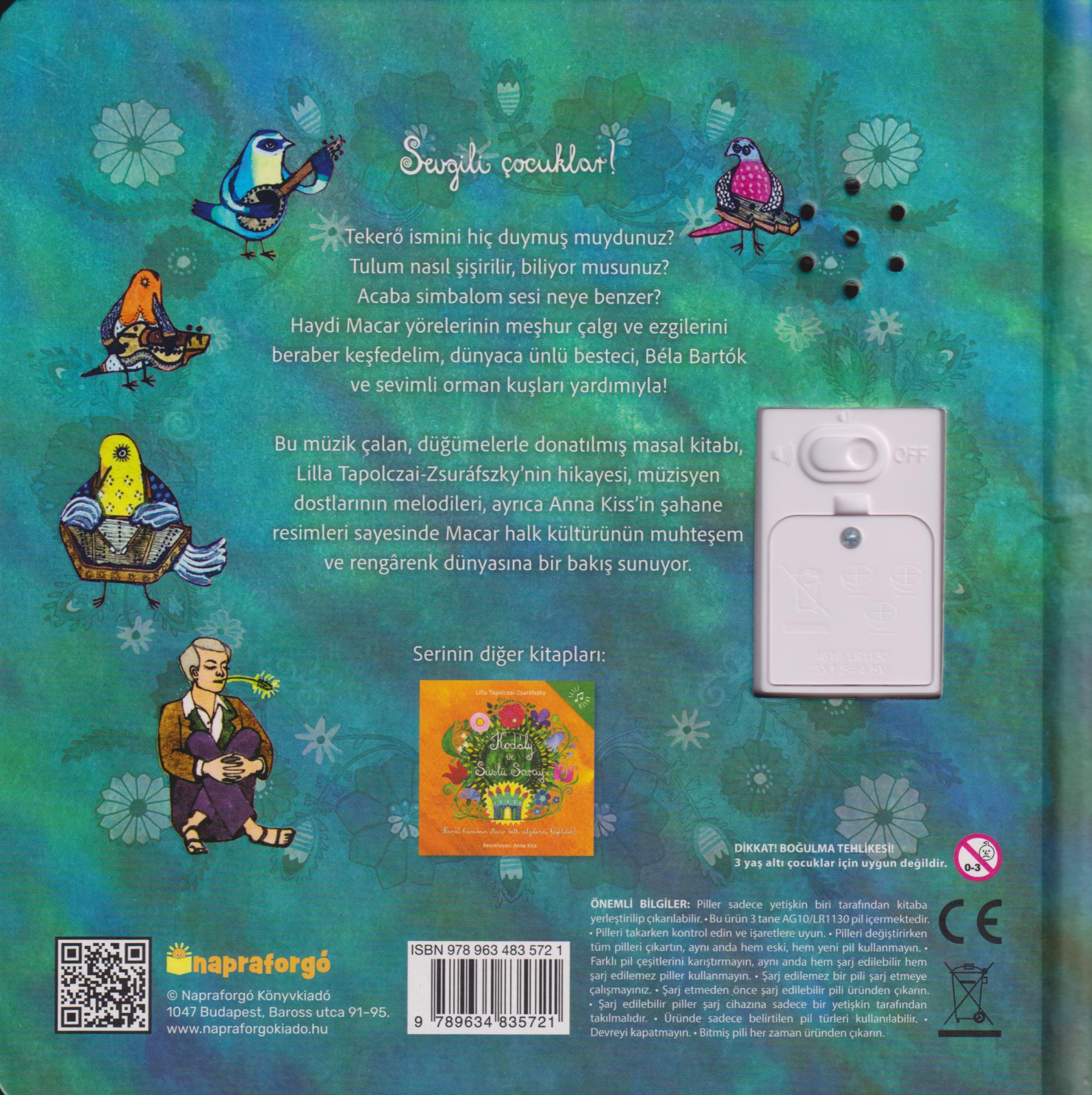 Have you ever heard of the hurdy-gurdy? Do you know how to play the bagpipe? What does the cimbalom sound like? Learn all about the traditional folk musical instruments and songs of the Hungarian countryside. The famous Hungarian composer, Béla Bartók, and the birds of the forest will guide you on your way. In this book, with the help of the 13 buttons sound module, children can get a real, authentic yet modern experience of Hungarian folk heritage. The story by Lilla Tapolczai-Zsuráfszky, the music played by her friends and the illustrations by Anna Kiss will help the reader to become acquainted with this wonderful world.