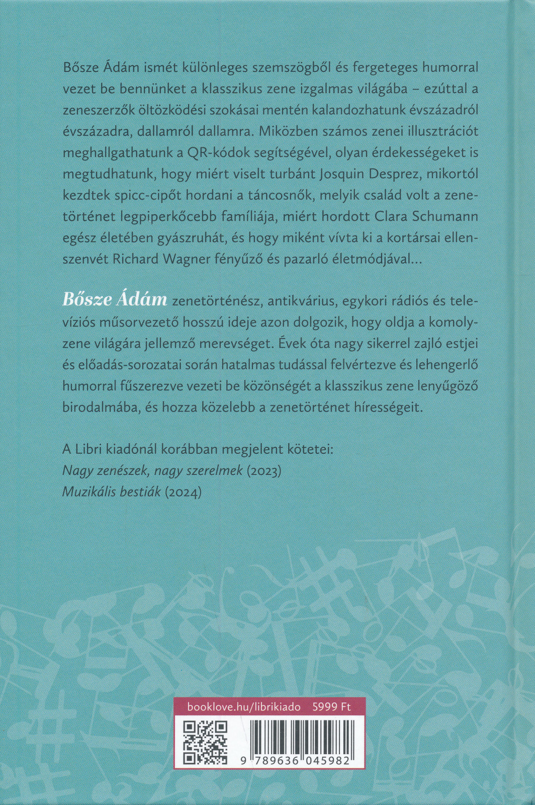 Miközben számos zenei illusztrációt meghallgathatunk a QR-kódok segítségével, olyan érdekességeket is megtudhatunk, hogy miért visel turbánt Orlando di Lasso az egyetlen ismert portréján, mikortól kezdtek spicc-cipőt hordani a táncosnők, melyik család volt a zenetörténet legpiperkőcebb famíliája, miért hordott Clara Schumann egész életében gyászruhát, és hogy miként vívta ki a kortársai ellenszenvét Richard Wagner fényűző és pazarló életmódjával…