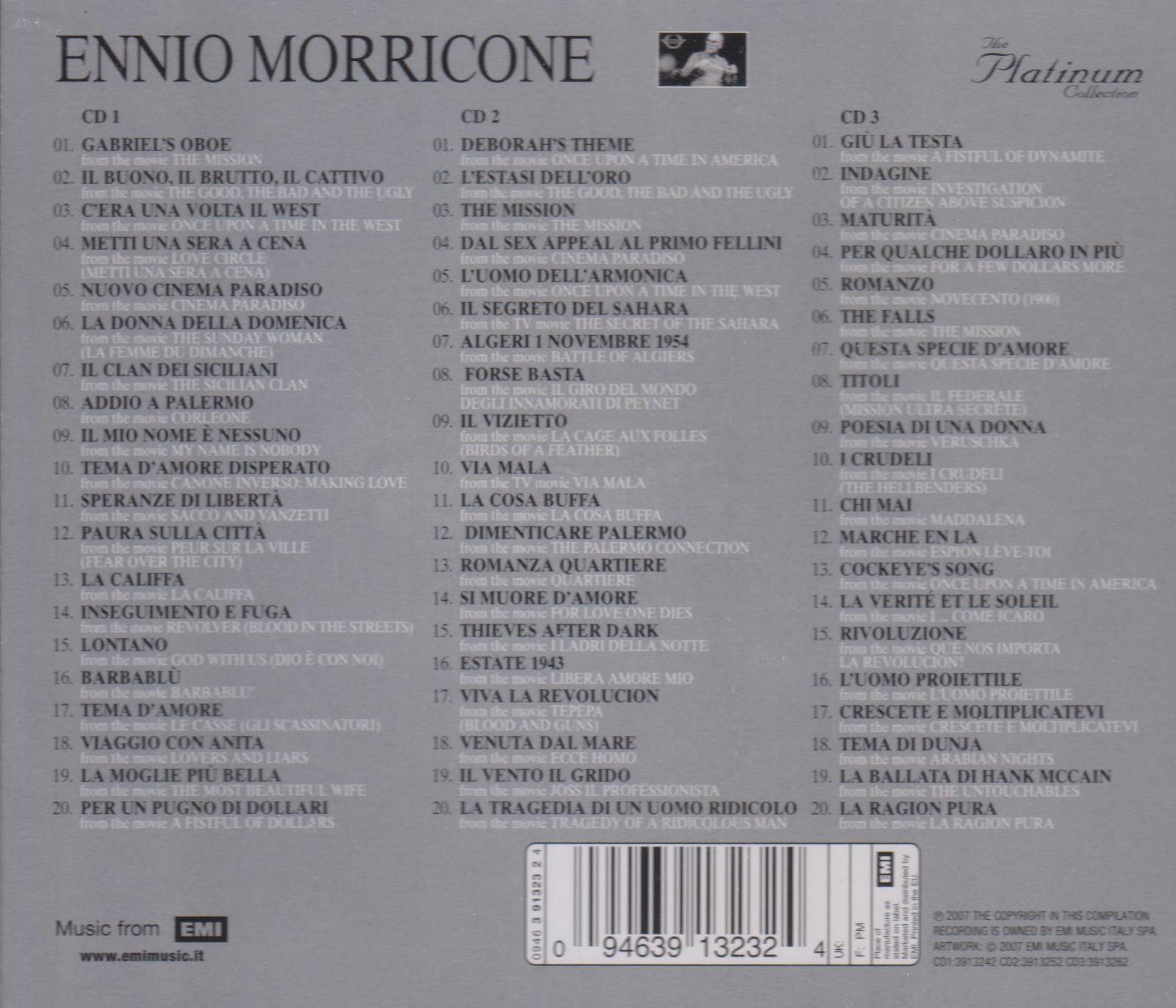 Gabriel's OboeIl Buono, Il Brutto, Il Cattivo (Titoli)C'era Una Volta Il WestMetti Una Sera a CenaNuovo Cinema Paradiso (Titoli)La Donna Della DomenicaIl Clan Dei SicilianiAddio a PalermoIl Mio Nome E NessunoTema D'amore DisperatoSperanze Di LibertaPaura Sulla CittaLa CaliffaInseguimento E FugaLontanoBarbabluTema D'amoreViaggio Con AnitaLa Moglie Piu BellaPer Un Pugno Di DollariDeborah's ThemeL'estasi Dell'oroThe MissionDal Sex Appeal Al Primo FelliniL'uomo Dell'armonicaIl Segreto Del SaharaAlgeri 1 Novembre 1954Forse BastaIl ViziettoVia MalaLa Cosa BuffaDimenticare PalermoRomanza QuartiereSi Muore D'amoreThieves After DarkEstate 1943Viva La RevolucionVenuta Dal MareIl Vento Il GridoLa Tragedia Di Un Uomo RidicoloGiu La TestaIndagineMaturitaPer Qualche Dollaro in PiuRomanzoThe FallsQuesta Specie D'amoreTitoliPoesia Di Una DonnaI CrudeliChi MaiMarche en LaCockeye's SongLa Verite et Le Soleil