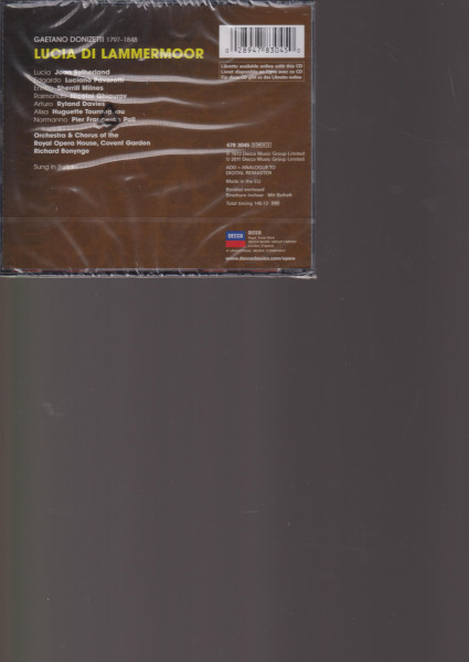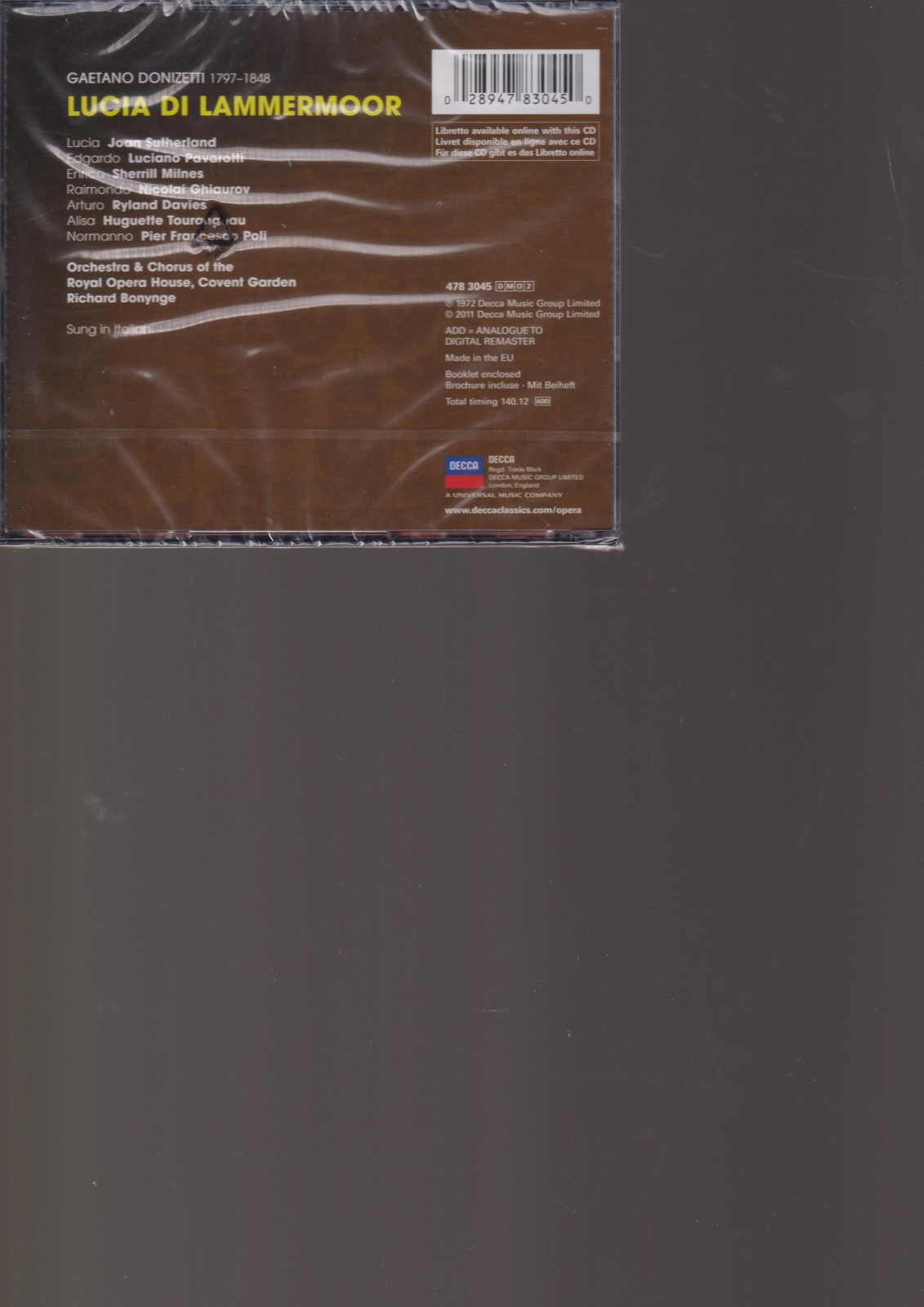 Joan Sutherland (Lucia), Luciano Pavarotti (Edgardo), Sherrill Milnes (Enrico), Nicolai Ghiaurov (Raimondo), Ryland Davies (Arturo), Huguette Tourangeau (Alisa), Pier Francesco Poli (Normanno)Chorus and Orchestra of the Royal Opera House, Covent Garden, Richard Bonynge