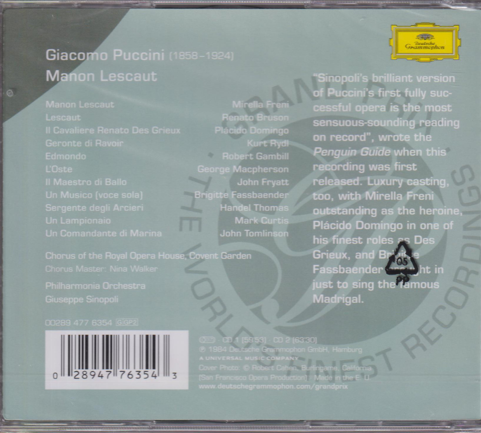 Mirella Freni (Manon Lescaut), Plácido Domingo (Des Grieux), Renato Bruson (Lescaut), Kurt Rydl (Geronte), Robert Gambill (Edmondo), Brigitte Fassbaender (Una voce sola), John Tomlinson (Un comandante di Marina), Philharmonia Orchestra, Covent Garden Chorus, Giuseppe Sinopoli