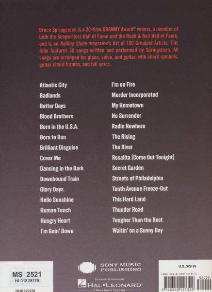 Songs include: Atlantic City · Badlands · Born to Run · Brilliant Disguise · Dancing in the Dark · Glory Days · Human Touch · Hungry Heart · I'm on Fire · My Hometown · The River · Secret Garden · Streets of Philadelphia · Tenth Avenue Freeze-Out · Thunder Road · Tougher Than the Rest · and more!