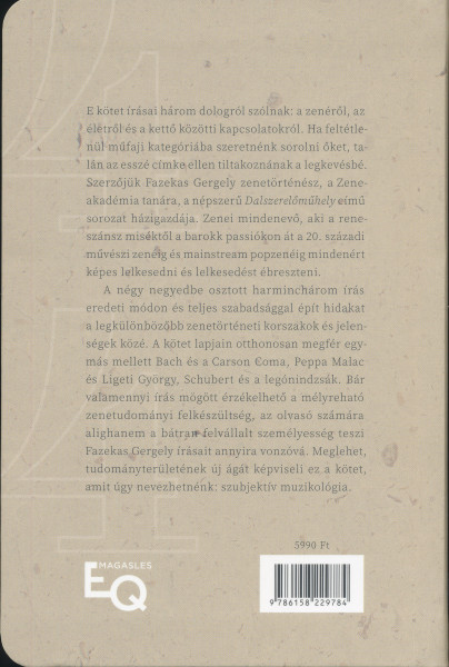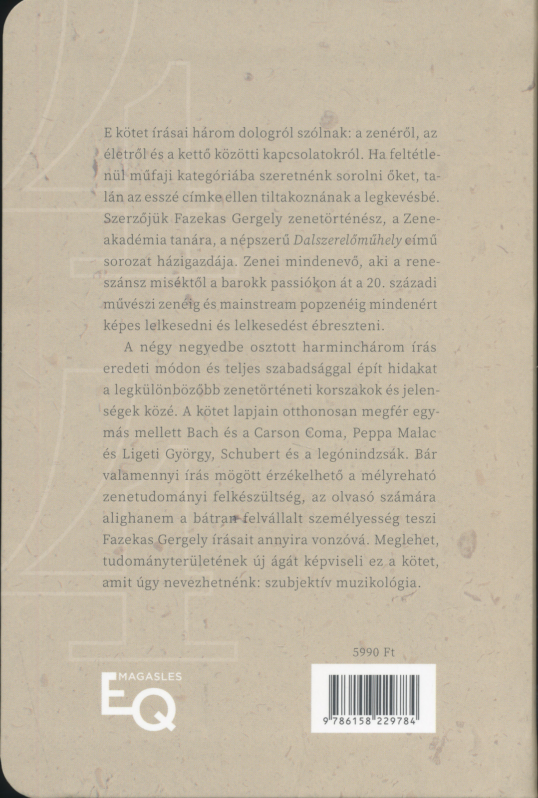 Kísérletek tehát, kísérletek arra, hogy megragadjuk, mi mindent jelenthet a zene számunkra. Bármely zene. A négy negyedbe osztott harminchárom írás eredeti módon és teljes szabadsággal épít hidakat a legkülönbözőbb zenetörténeti korszakok és jelenségek közé. A kötet lapjain otthonosan megfér egymás mellett Bach és a Carson Coma, Peppa Malac és Ligeti György, Schubert és a legónindzsák.Bár valamennyi írás mögött érzékelhető a mélyreható zenetudományi felkészültség, az olvasó számára alighanem a bátranfelvállalt személyesség teszi Fazekas Gergely írásait annyira vonzóvá. Meglehet, tudományterületének új ágát képviseli ez a kötet, amit úgy nevezhetnénk: szubjektív muzikológia.