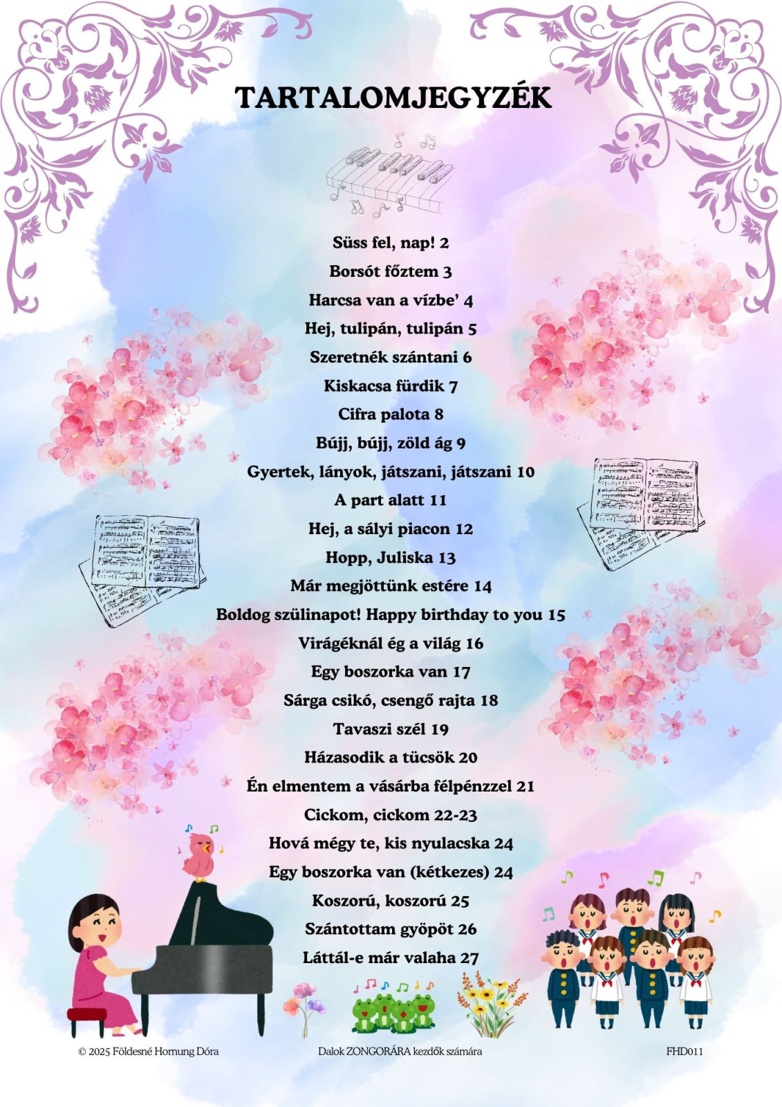 Sok szeretettel ajánlom ezt a kiadványt azoknak a zongoratanároknak és kezdő zongoratanulóknak, akik a zeneiskolai tanulmányokat szívesen kiegészítenék könnyen játszható, szép népdalokkal.