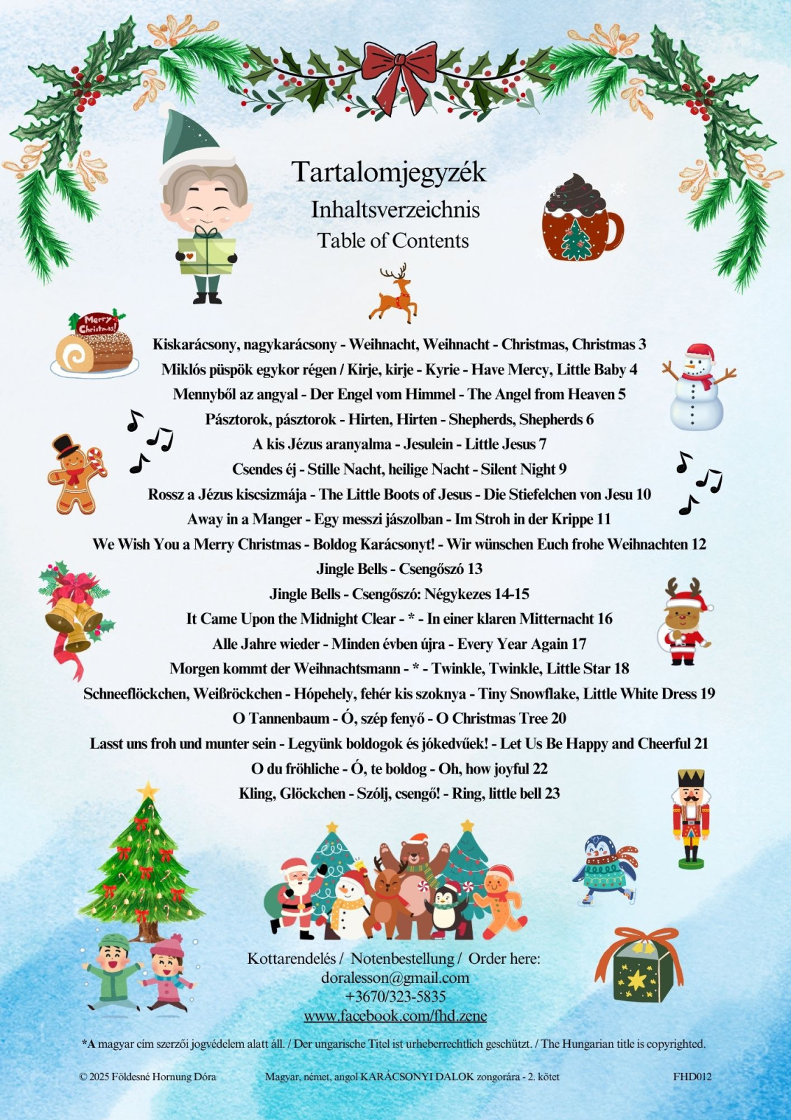 Ebben a kottában a karácsonyi dalok már kétkezes zongoradarabokként szerepelnek, azaz egyidejűleg játszik a két kéz. Az előző kötethez képest ez már magasabb nehézségi szint, hiszen a jobb kéz játssza a dallamot, a bal kéz pedig kísér. A zongorakottákatgitárakkordokkal egészítettük ki, valamint egy kivehető hegedűkottával, hogy a családban vagy iskolában való közös zenélés lehetősége is adva legyen.
