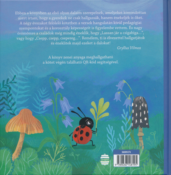 Ebben a könyvben az első olyan dalaim szerepelnek, amelyeket kimondottan azért írtam, hogy a gyerekek ne csak hallgassák, hanem énekeljék is őket. A négy évszakot felölelő kötetben a versek hangulatán kívül pedagógiai szempontokat és a korosztály képességeit is figyelembe vettem. És nagy örömömre a családok még mindig fújják, hogy ,,Lassan jár a csigabiga..., vagy hogy ,,Csepp, csepp, csepereg...". Remélem, ti is élvezettel hallgatjátok és hamarosan a szüleitekkel együtt éneklitek majd ezeket a dalokat!"